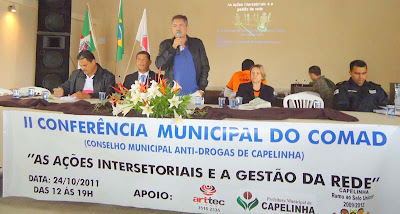 Na abertura oficial da II Conferência Municipal do COMAD houve pronunciamento das autoridades: Dra. Lívia Lúcia Oliveira Borba, Juíza de Direito da Comarca de Capelinha (segunda vara), Dr. Pedro Vieira da Silva, prefeito municipal, Maria da Conceição Vieira, presidente do COMAD, Laerte Ferreira dos Santos, presidente da Câmara Municipal de Capelinha e Orlando Costa de Sousa, presidente do COMAD de Carbonita. As Ações Intersetoriais e a Gestão da Rede foi o tema debatido durante a II Conferência Municipal do COMAD (Conselho Municipal Anti-Drogas) de Capelinha que contou com a presença de representantes da Polícia Militar das cidades circunvizinhas, Câmara Municipal, Prefeitura Municipal, Secretários Municipais, Conselho Tutelar, CREAS, PAIR, CMDCA, CRAS. Esf’s, Rotary Club, Banco do Brasil, PETI, Pastoral da Criança, Clubes de Mães, Lar Mamãe Dolores, APAE, Hospital Municipal, Paróquia Nossa Senhora da Graça, Igreja Assembléia de Deus Shekinar, Igreja Renascer, Escolas municipais, particulares e estaduais, Pro Jovem Adolescente, Casa Lar Masculina, Clínica Odontológica, NASF, Casa da Cultura, Grupo de Teatro Animart, Grupo Pro Riso, Fórum, Sou Mais Minas, Jornal A Cidade, Conselho Estadual de Políticas Públicas Sobre Drogas de Minas Gerais, além da sociedade civil.